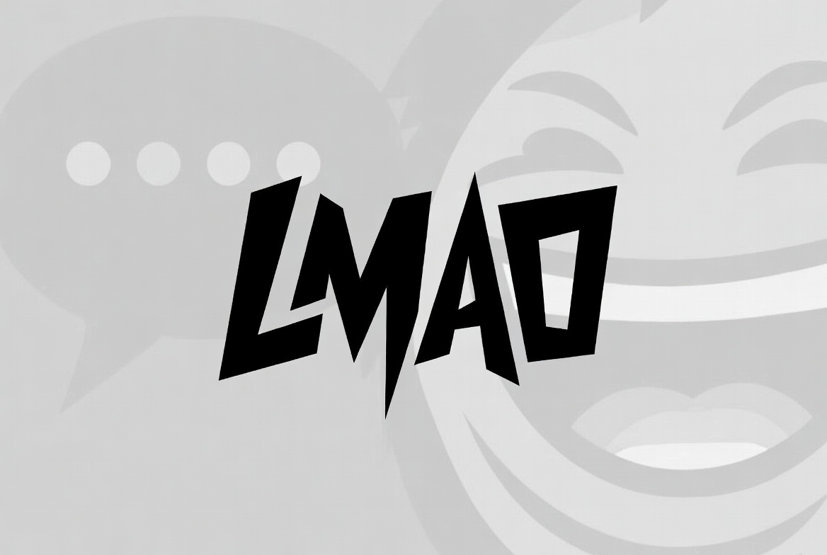Bold black LMAO text in stylized font sits on a light gray background. Surrounding it are gray laughing emoji faces with open mouths and cheerful expressions. Small gray dots add texture to the design.