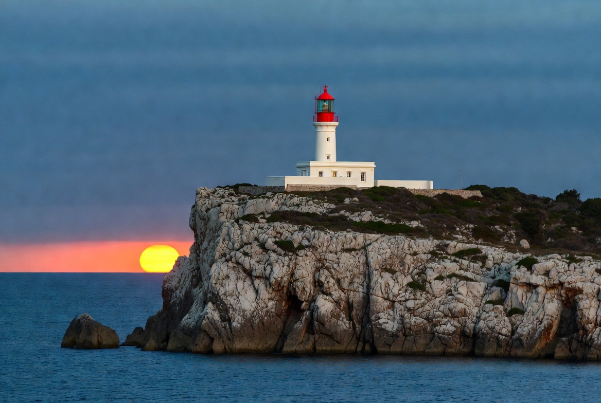 A white lighthouse with a red lantern sits atop a rocky cliff overlooking the ocean. The sun sets on the horizon, casting an orange glow over the blue sea and cloudy sky. The structure is positioned on a grassy, rugged promontory with waves below.