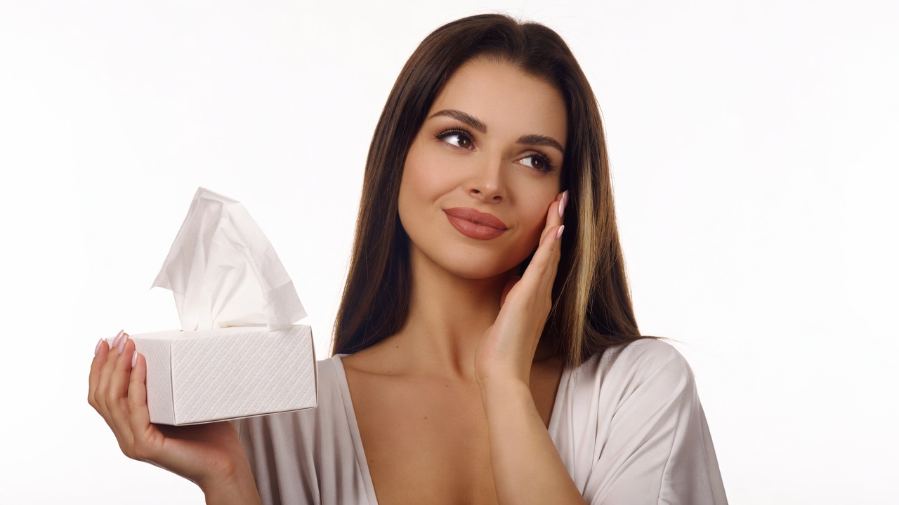 A young woman with long brown hair holds a white tissue box in one hand while touching her cheek with the other. She has a thoughtful expression with pursed lips and gazes slightly to the side. She wears a white off-shoulder top against a plain white background.