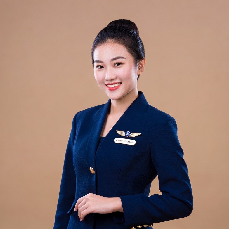 A young Asian woman with black hair in a bun smiles at the camera. She wears a navy blue flight attendant uniform with gold buttons, a name badge, and winged emblem on the lapel. She stands against a beige background with hands clasped in front.