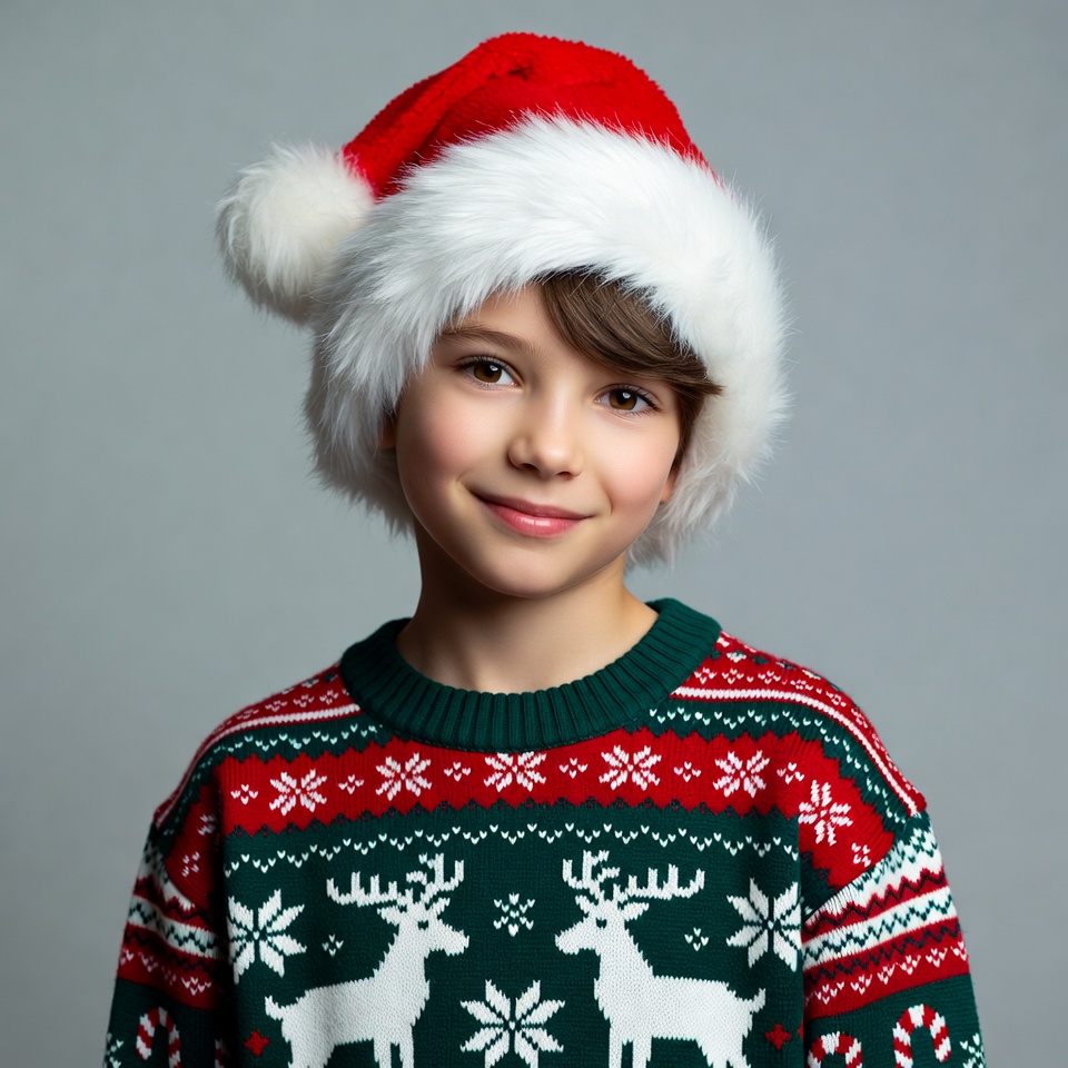 Christmas pattern, Christmas sweater, Santa hat, brown hair, festive boy, fluffy Santa hat, front view, gray background, green sweater, holiday outfit, portrait, red Santa hat, reindeer sweater, smiling boy, smiling face, snowflakes, white reindeer, winter clothing, young boy, boy