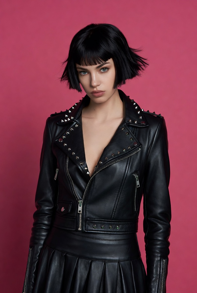 A young woman with a short black bob haircut and striking eyes poses confidently against a bright pink background. She wears a black leather jacket adorned with silver studs and a deep V-neckline, paired with a matching black leather pleated skirt. Her outfit features long sleeves and edgy details.