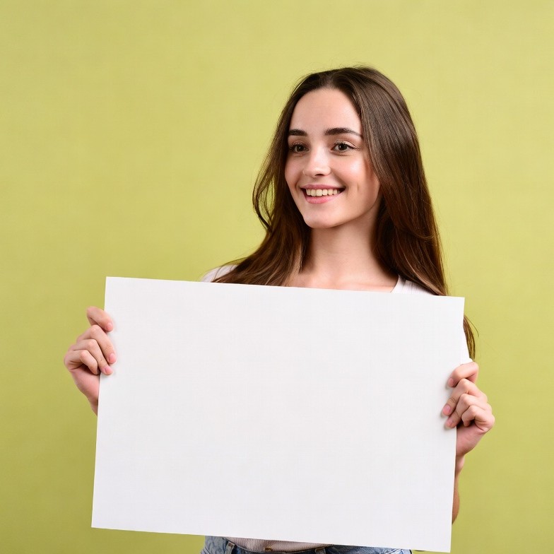 A young woman with long brown hair smiles while holding a large blank white sign in front of her. She wears a white t-shirt and light blue jeans against a bright green background. She stands confidently with the sign covering part of her body.