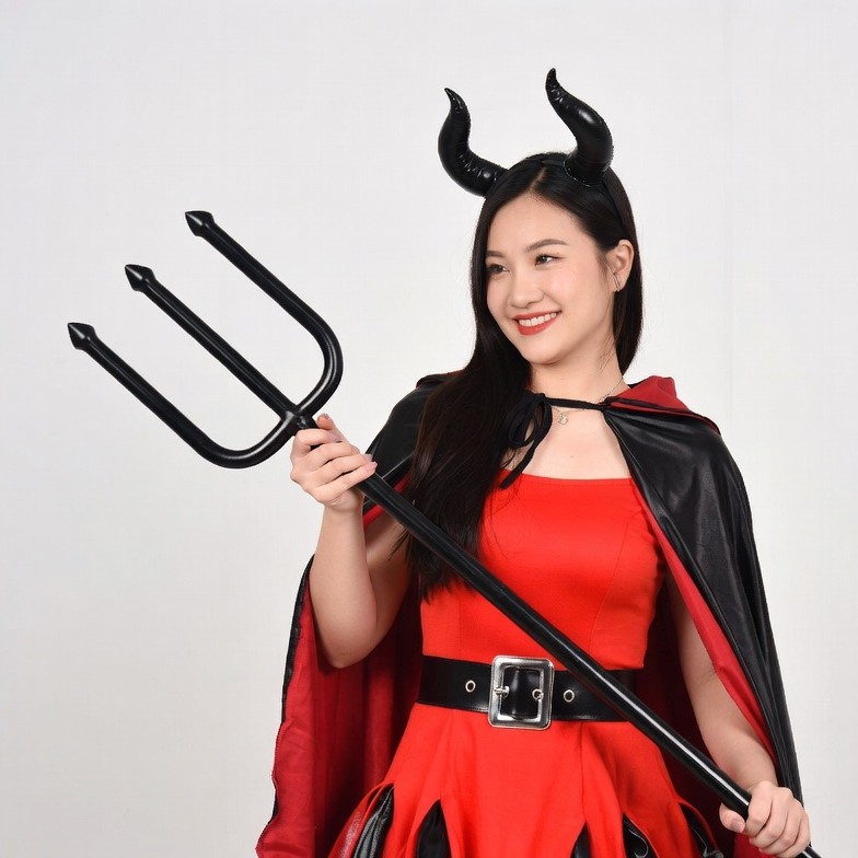 Asian, Halloween, black cape, costume, devil horns, female, horns, isolated background, long hair, pitchfork, red dress, sexy costume, smiling, trident, woman, devil costume