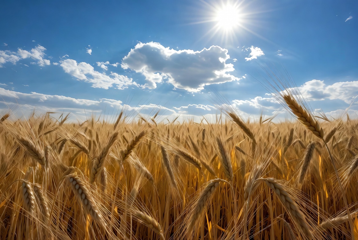 A vast field of golden wheat sways under a bright sun in a clear blue sky. Fluffy white clouds dot the horizon, with one heart-shaped cloud near the sun. The ripe wheat stalks fill the foreground, creating a textured landscape.