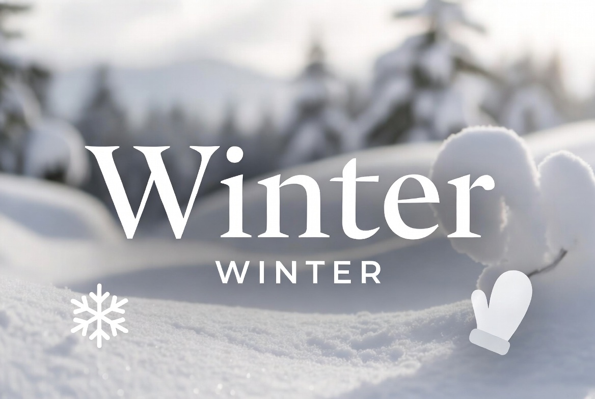 A snowy winter landscape features the word 'Winter' repeated in large white elegant font across the image. Snowflakes and a white mitten are visible in the foreground on the snow-covered ground. Pine trees covered in snow appear in the blurred background.