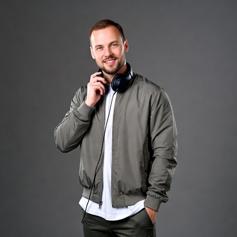 A young man with short brown hair smiles confidently while wearing black over-ear headphones around his neck. He is dressed in a gray bomber jacket over a white t-shirt and green pants, standing against a plain gray background. His hand rests on the headphones as he poses casually.