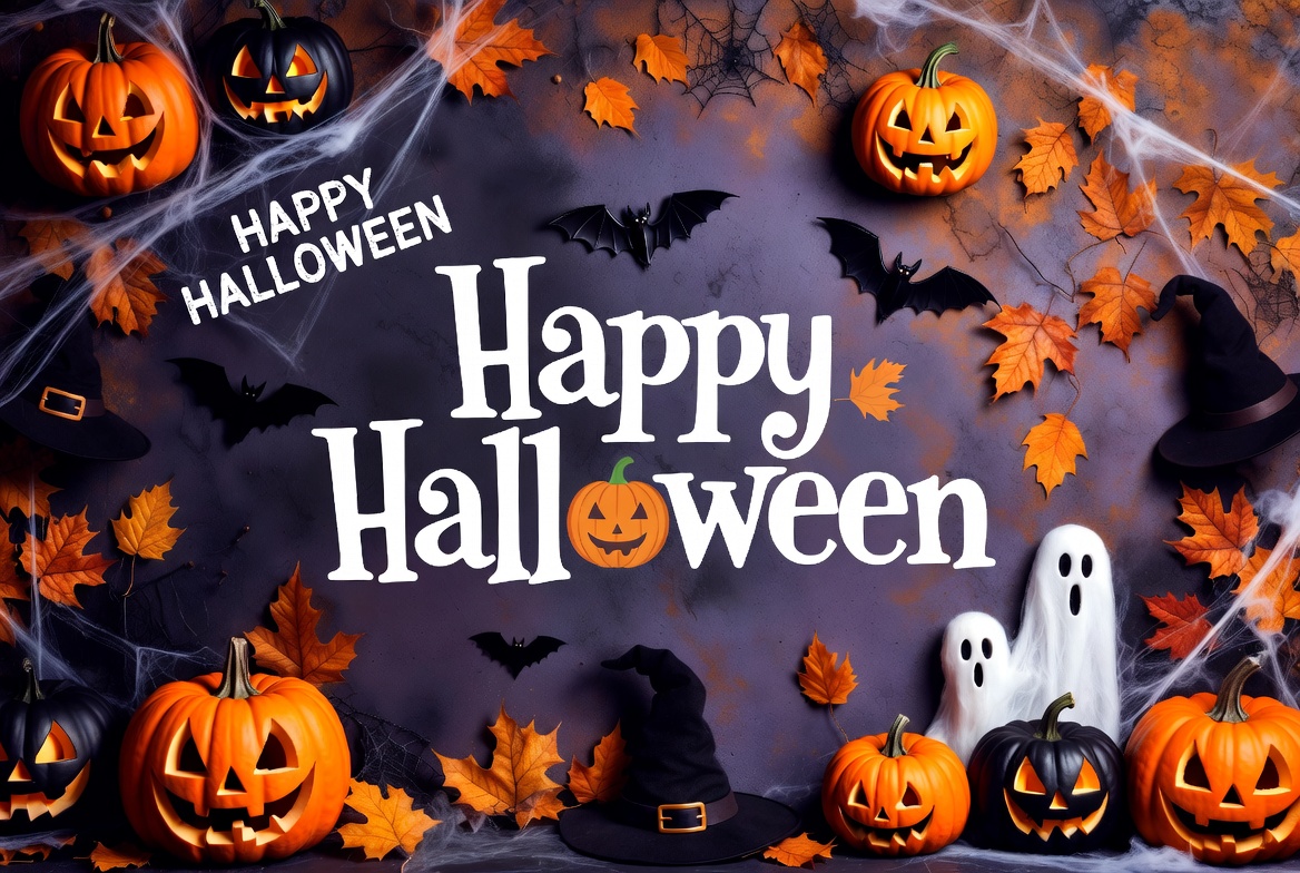 A festive Halloween background features bold 'Happy Halloween' text in white letters. It includes carved pumpkins, ghosts, bats, witch hats, spider webs, and scattered autumn leaves on a dark purple backdrop. The elements are arranged in a flat lay style for a spooky holiday greeting.