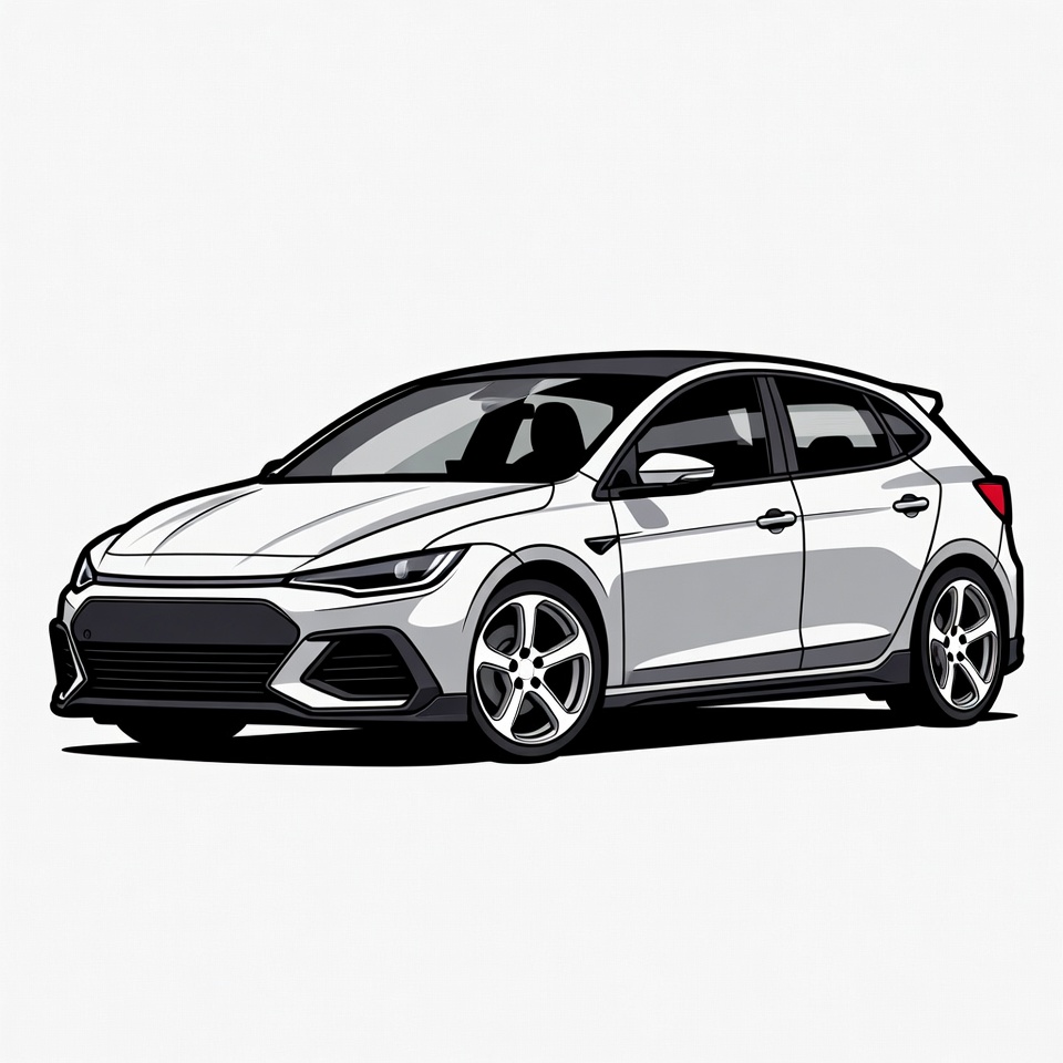 alloy rims, auto design, automobile, black accents, car graphic, car illustration, clipart, compact car, digital illustration, front grille, hatchback, isolated background, modern car, sedan, silver wheels, sleek design, sports car, vector art, vehicle, white hatchback, white car
