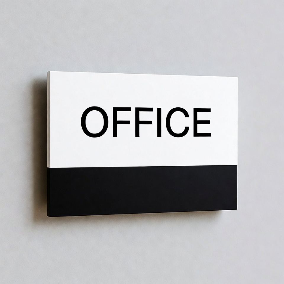 A rectangular office sign with a white upper section and black lower section is mounted on a gray wall. Bold black 'OFFICE' text is centered on the white part. The sign has a clean, modern design against an isolated background.