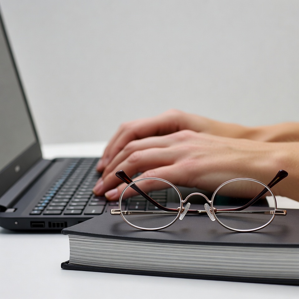 A pair of hands types on the keyboard of an open black laptop on a white desk. Round wire-rimmed glasses rest on a thick black book beside the laptop. The scene is viewed from above against a plain white background.