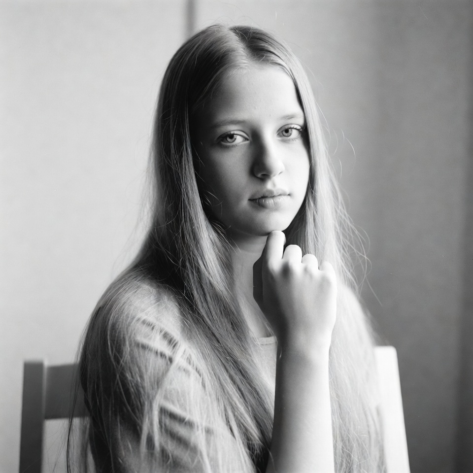 A young woman with long straight hair poses thoughtfully in a black and white photograph. She rests her hand on her chin with fingers touching her lips, gazing directly at the camera. She wears a simple top and sits against a plain light background near a window.
