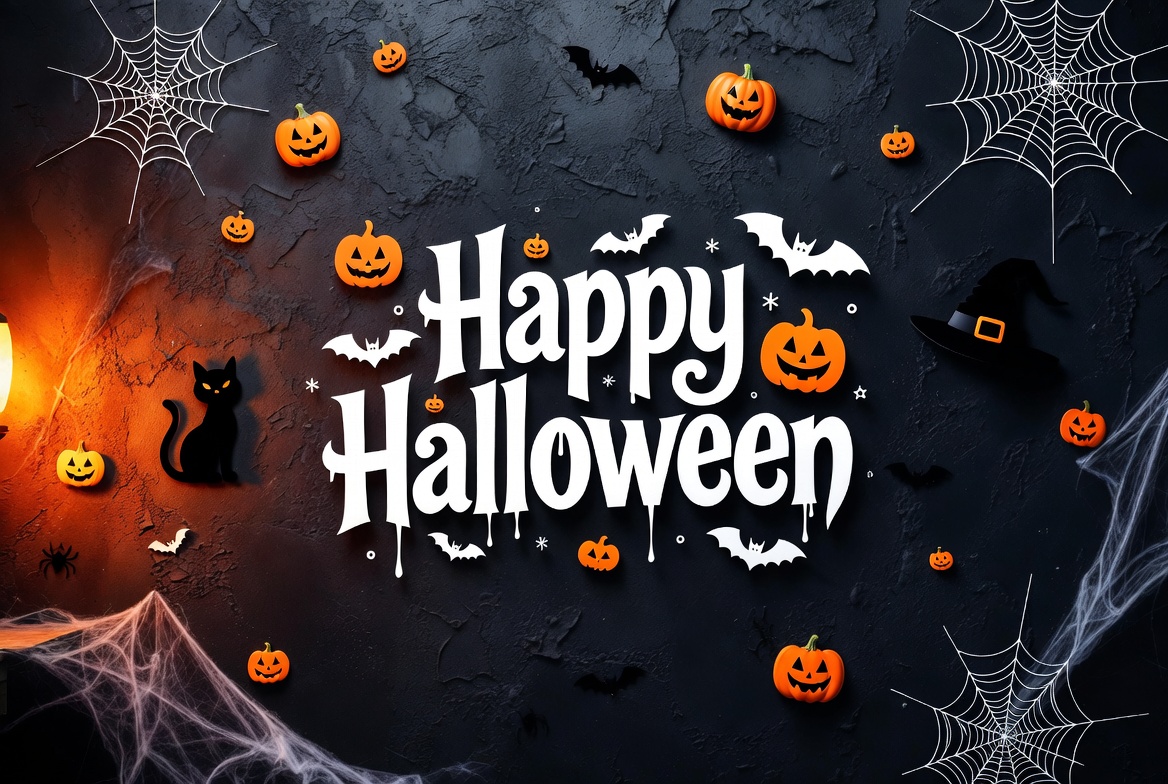 A festive Halloween graphic features bold 'Happy Halloween' text in orange and white lettering on a dark textured background. Surrounding elements include carved pumpkins, black cats, bats, witch hats, spider webs, and glowing orange lanterns. The design uses a spooky black surface with scattered Halloween decorations.