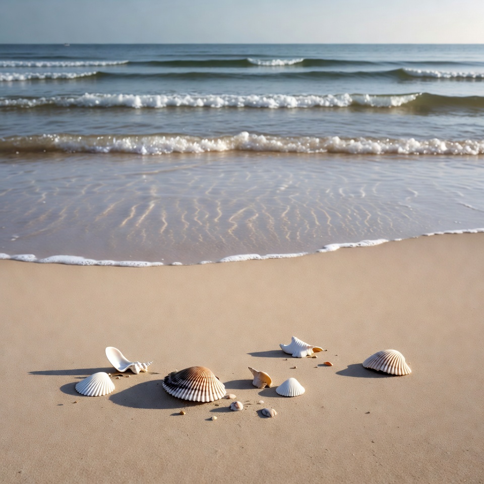 Various seashells including conch and starfish are scattered on a light beige sandy beach. Gentle waves from the calm ocean lap at the shore in the background. The scene features a clear sky during daytime with soft lighting.