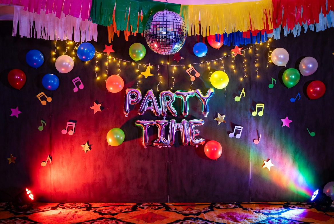 balloons, birthday party, celebration, dark background, disco ball, event setup, festive decoration, foil balloons, hanging garlands, multicolored balloons, musical notes, party decoration, party time, shiny floor, spotlights, stars, streamers, string lights, vibrant colors, party backdrop