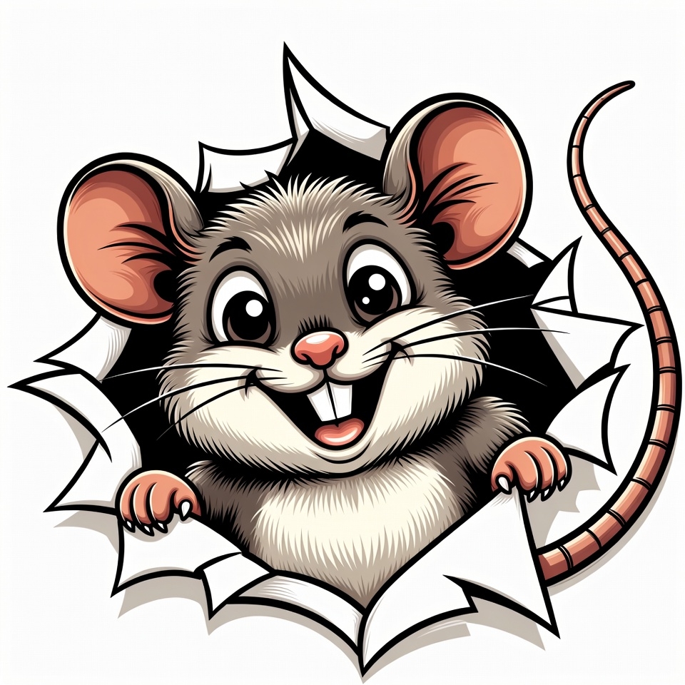 A cartoon mouse with gray fur and big sparkling eyes peeks through a torn paper hole. It has pink ears, a long tail, and paws gripping the edges while smiling happily. The isolated white background emphasizes the illustration.