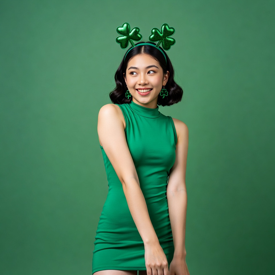 A smiling Asian woman with short wavy black hair wears a green shamrock headband and dangling shamrock earrings. She poses in a form-fitting green sleeveless dress against a solid green background. Her expression is cheerful with a slight tilt of the head.