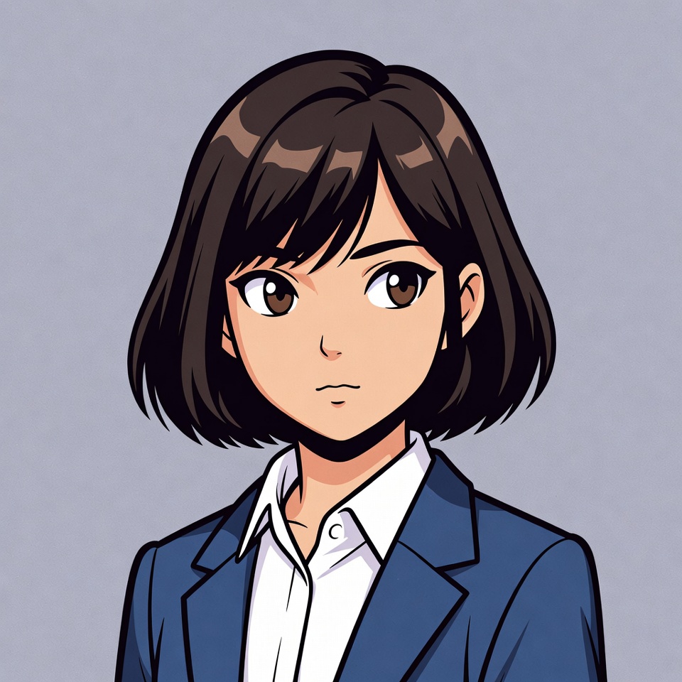 Asian, bangs, blue suit, bob haircut, brown eyes, brown hair, cartoon, collared shirt, female, illustration, isolated background, navy blazer, portrait, professional attire, stylish, white shirt, woman, young woman, anime girl