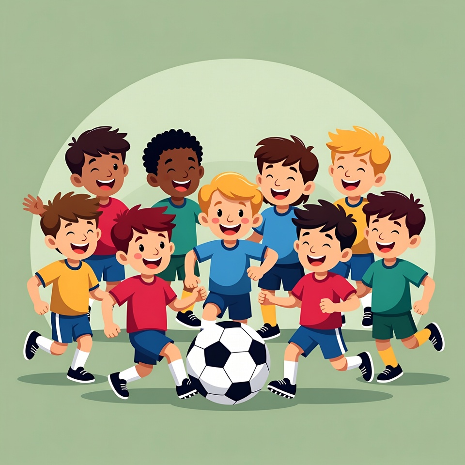 A vibrant illustration shows eight cartoon boys of diverse ethnicities joyfully playing soccer on a green background. They wear colorful jerseys and shorts, kicking a black-and-white soccer ball with dynamic poses and big smiles. The boys have varied skin tones including African-American, White, and Multiracial features.