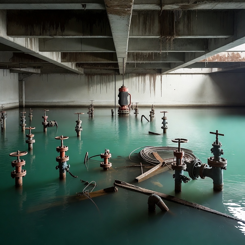 abandoned building, concrete beams, concrete ceiling, debris, derelict space, fire hydrant, flooded basement, flooded floor, flooded room, green water, icicles, industrial decay, industrial pipes, pipe fittings, red hydrant, rust stains, rusted pipes, rusty metal, shallow water, turquoise water, underground room, valves, water damage, water pipes, abandoned room