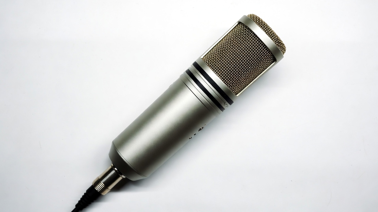 XLR cable, audio equipment, condenser mic, isolated background, mesh grille, music gear, podcast mic, professional mic, recording microphone, silver microphone, sound equipment, studio mic, vocal microphone, white background, microphone