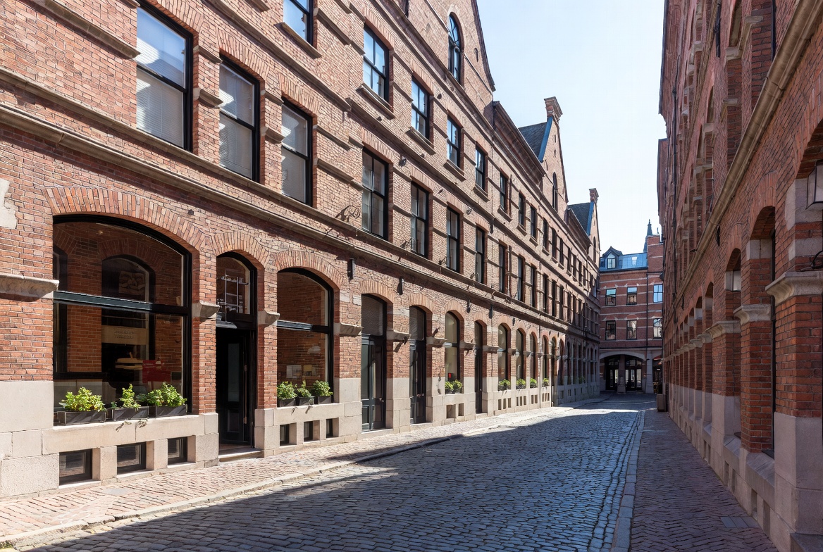 alleyway, arched windows, black frames, cobblestone street, courtyard, european architecture, gabled roofs, green plants, historic buildings, industrial architecture, narrow alley, potted plants, red brick, stone base, sunlight shadows, urban street, warehouse, brick buildings