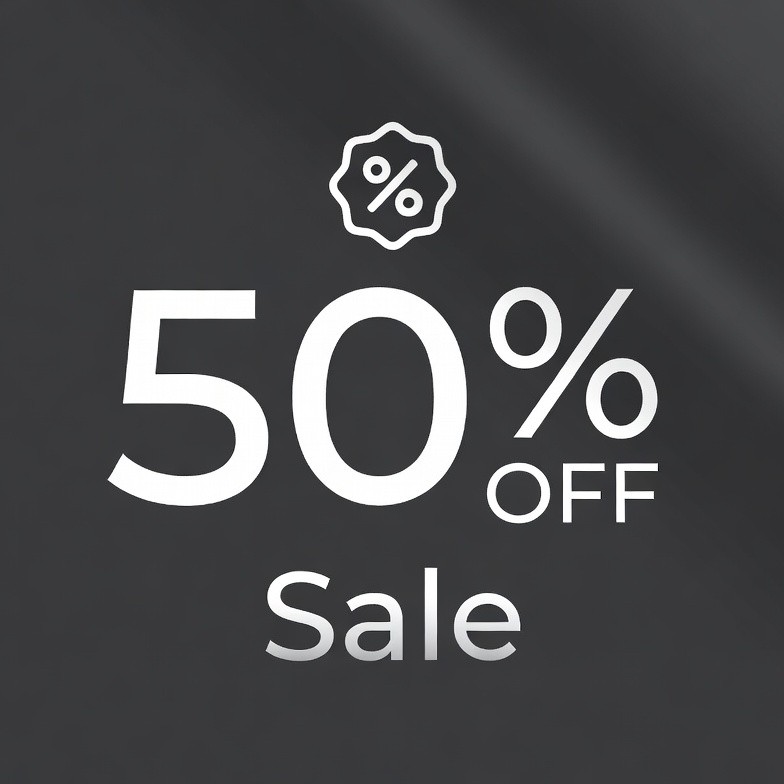 badge, black background, deal, discount, glossy, offer, percent sign, price reduction, promotion, sale, sales sign, shiny, shopping, starburst, white text, 50% off