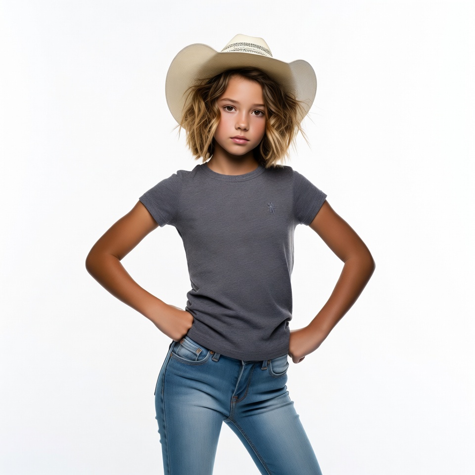 A young girl with wavy blonde hair stands confidently with hands on hips. She wears a large white cowboy hat, gray short-sleeved t-shirt, and blue jeans. The image is set against a plain white background.