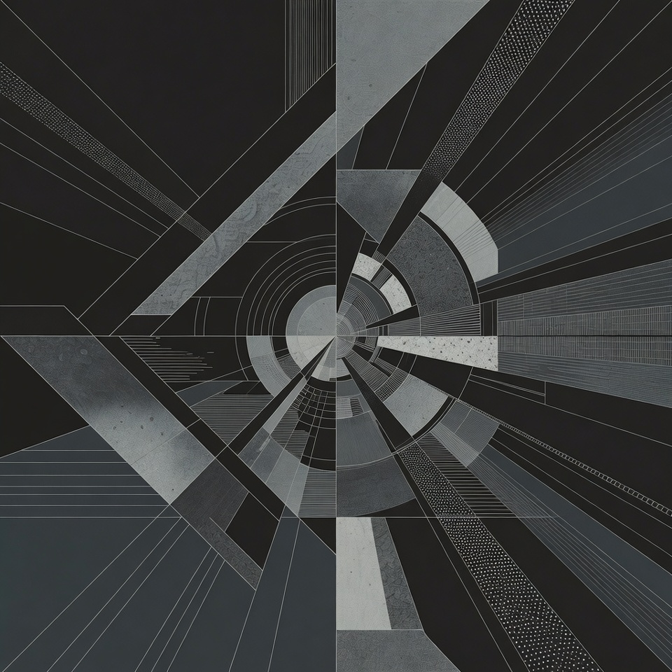 An abstract illustration features a central white circle surrounded by radiating gray geometric shapes and lines. Triangular and rectangular forms extend outward in a symmetrical pattern against a dark background. The composition creates a dynamic sense of movement and depth using various shades of gray.