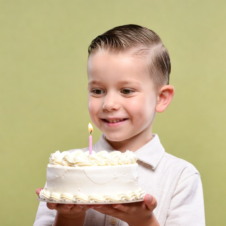 A young boy with neatly combed hair holds a small white-frosted birthday cake with a single pink candle lit on top. He wears a light-colored collared shirt and smiles happily while looking at the camera. The image is set against a solid green background.