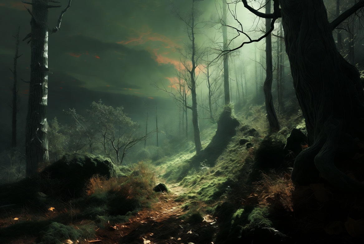 atmospheric fog, autumn forest, bare trees, barren trees, digital art, dirt path, eerie landscape, fog, foggy trees, forest mist, green sky, illustration, misty woods, mossy rocks, nature scene, orange sunset, spooky woods, twisted branches, woodland path, dark forest