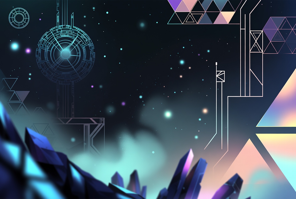 A vibrant digital illustration features glowing geometric shapes like triangles, polygons, and crystalline structures against a starry dark blue space background. Neon lines, rings, and particles create a futuristic cosmic atmosphere. Multicolored prisms and misty effects add depth and luminescence.