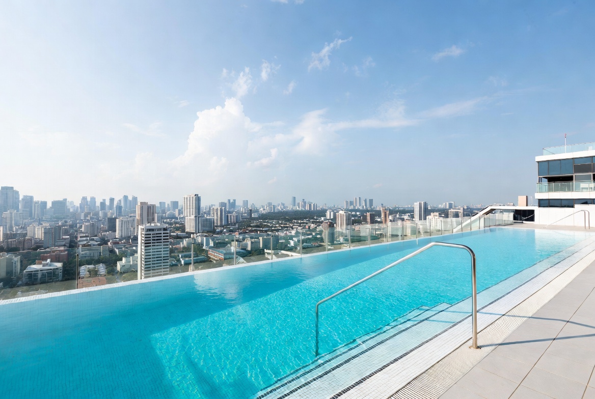 aerial view, blue sky, blue water, city skyline, city view, cityscape, clear sky, elevated pool, glass railing, high-rise buildings, horizon, luxury pool, metal railing, modern architecture, outdoor pool, pool edge, pool ladder, poolside, rooftop pool, rooftop view, skyscrapers, sunny day, swimming pool, urban skyline, white tiles, infinity pool