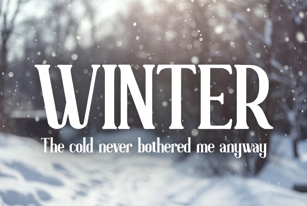 Large white 'WINTER' text overlays a snowy winter landscape with falling snowflakes and bare trees. A blurred snowy ground and bokeh lights create a festive atmosphere. The quote 'The cold never bothered me anyway' appears below in elegant font.