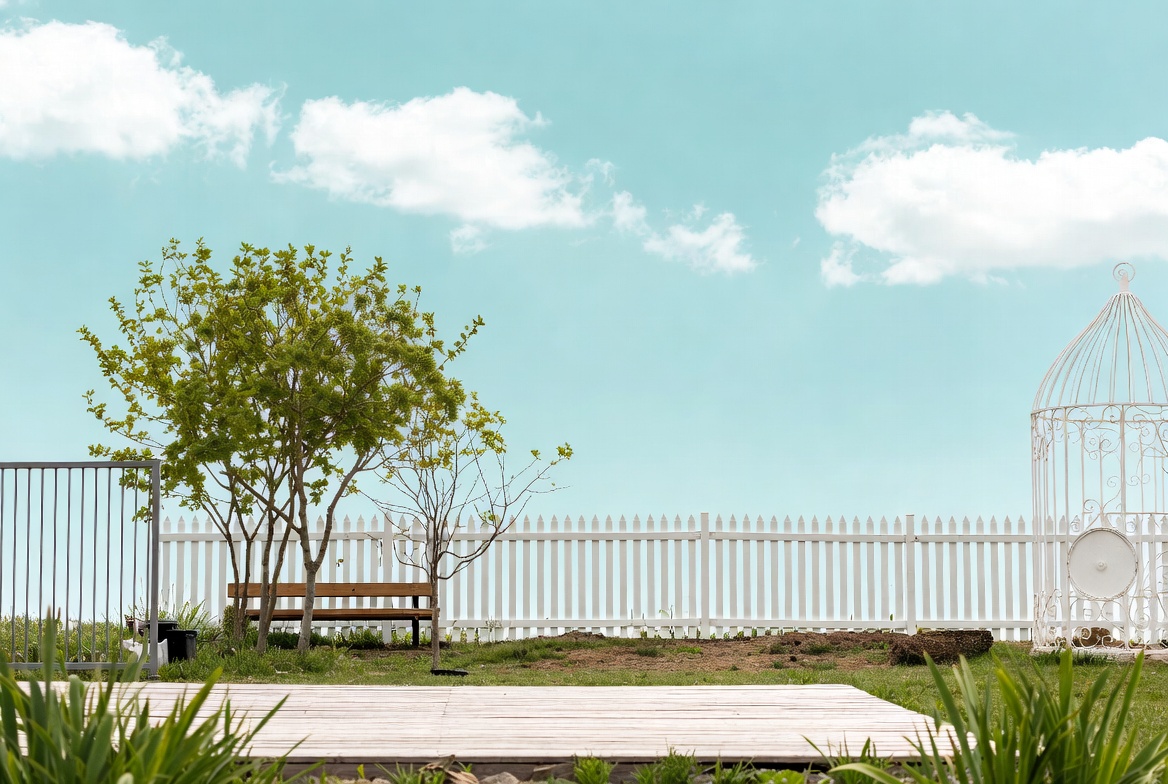 bench, birdcage, blue sky, clouds, fence, garden, grass, green tree, isolated background, outdoor, picket fence, platform, white picket fence, wooden bench