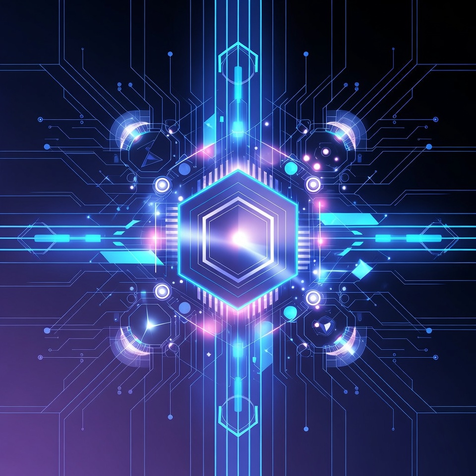A futuristic digital illustration features a central glowing hexagon with neon blue circuit lines radiating outward on a dark purple background. Hexagonal panels and geometric nodes emit bright cyan and white lights. Intricate circuit patterns and glowing elements create a high-tech symmetrical design.
