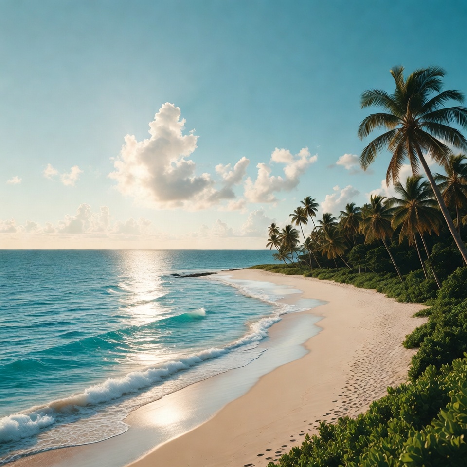 A pristine white sand beach curves along the turquoise ocean with gentle waves lapping at the shore. Tall palm trees line the edge of the beach amid lush green vegetation. The sky is bright blue with scattered white clouds and golden sunlight reflecting on the water.