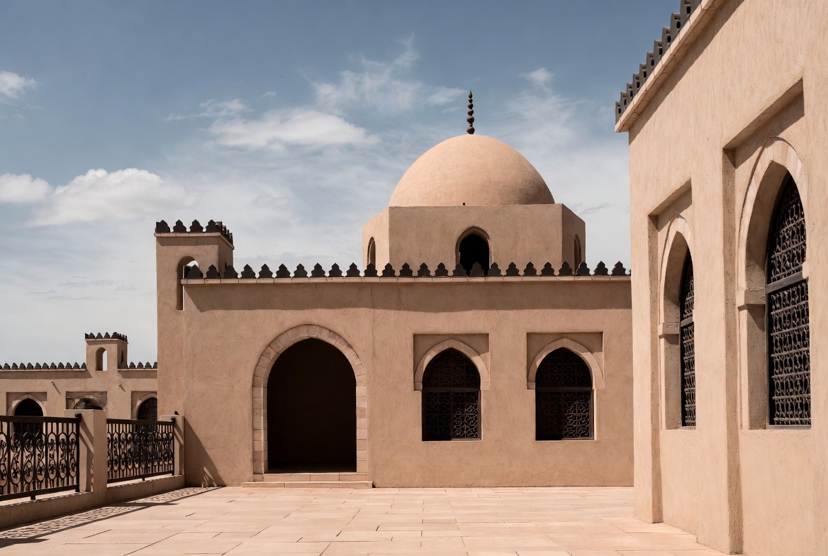 Islamic architecture, Middle Eastern, ancient mosque, arched windows, arches, architecture, beige stone, blue sky, courtyard, dome, exterior view, landmark, minaret, ornate details, railing, religious building, sand-colored, spire, tiled floor, traditional building, mosque