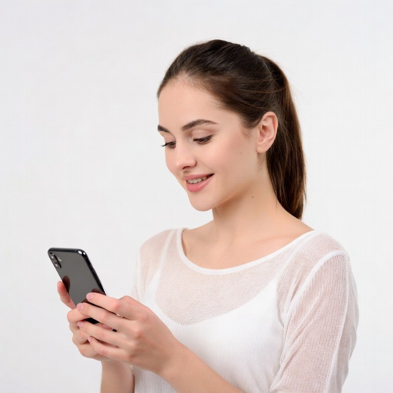 A young woman with long brown hair in a ponytail looks at her black iPhone with a slight smile. She wears a sheer white top and holds the phone with both hands. The image is set against a plain white background.