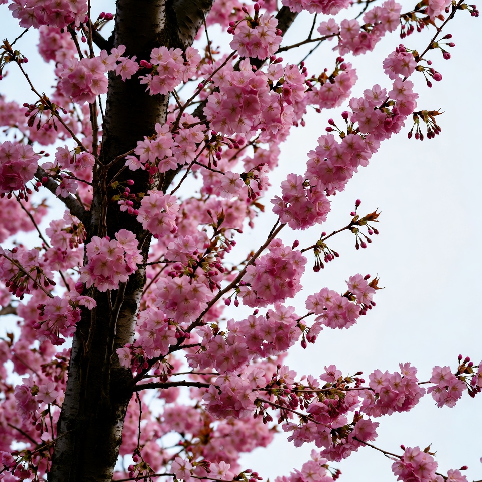Japanese cherry, blooming tree, blossoms, floral, flower clusters, fresh flowers, nature, outdoor, petals, pink flowers, sakura, spring, tree branches, tree trunk, vibrant pink, white sky, cherry blossom