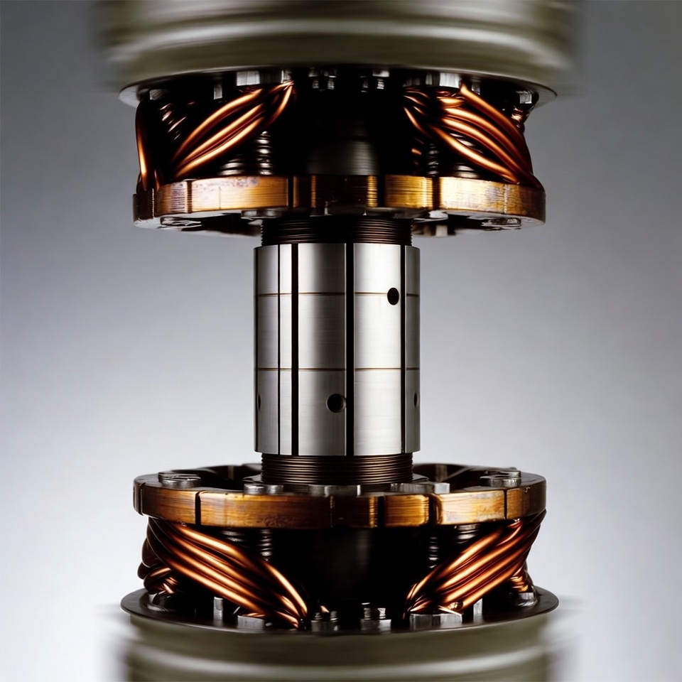 A detailed close-up view of an electric motor shows copper wire windings wrapped around metallic cores. The central shaft is silver with holes, flanked by two symmetric rotor and stator assemblies. Bronze-colored components and bolts secure the structure on an isolated background.