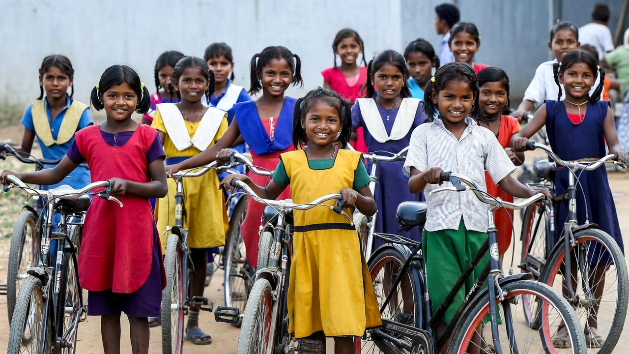 A large group of young Indian girls in colorful school uniforms stands together holding bicycles on a dirt path. They wear dresses in vibrant shades of red, blue, yellow, green, and pink with white collars. Several boys are visible in the background near a gray wall.