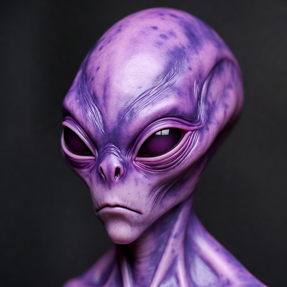 3D render, UFO, alien face, bald head, black eyes, closeup, creature, dark background, digital art, extraterrestrial, humanoid alien, illustration, isolated background, large eyes, portrait, purple alien, purple skin, sci-fi, smooth skin, space creature, alien