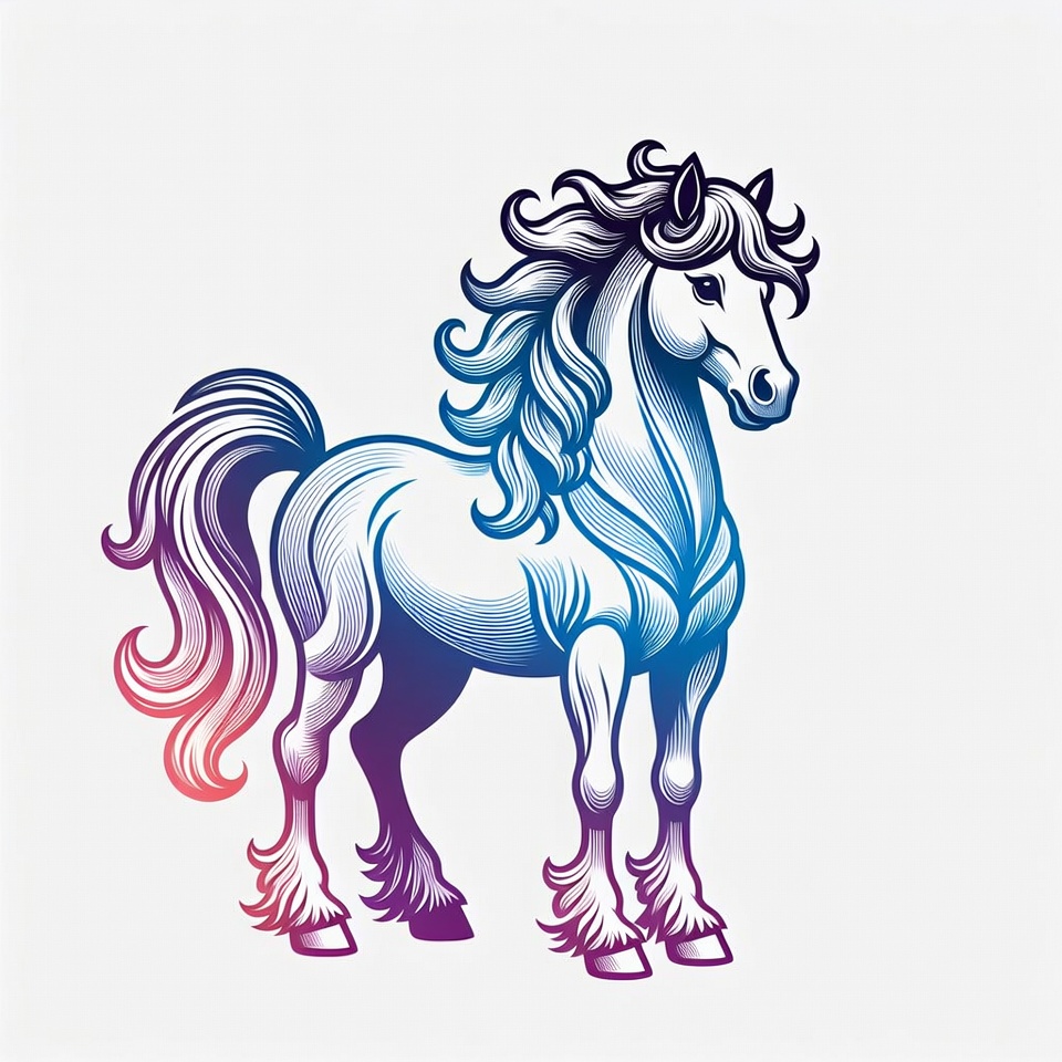 animal illustration, artistic horse, blue horse, clipart, colorful horse, detailed drawing, fantasy horse, flowing mane, gradient horse, illustration, isolated background, line art, long tail, majestic horse, pink horse, purple horse, standing horse, vector art, white background, horse