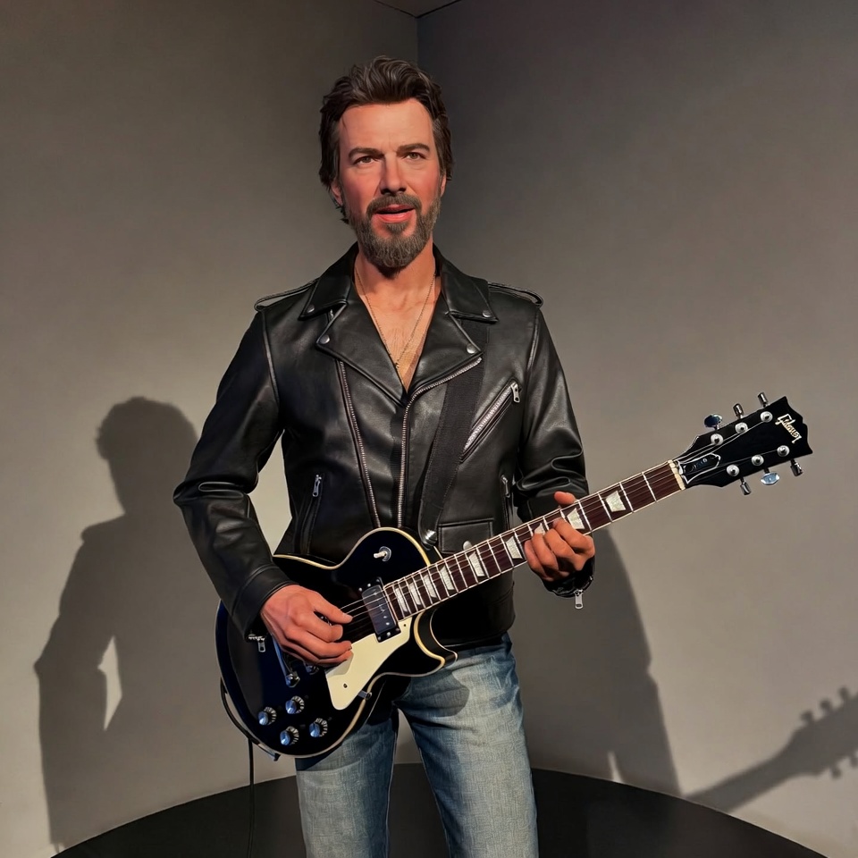 Gibson Les Paul, White, beard, black jacket, blue jeans, dark hair, electric guitar, gray background, guitar, jeans, leather jacket, male, musician, portrait, rockstar, shadow, short hair, standing, studio, wax figure, man