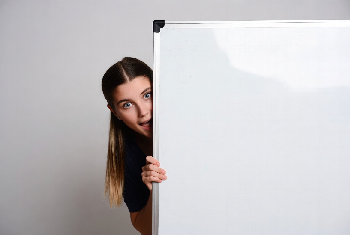 A young woman with long brown hair peeks from behind a large white whiteboard. She wears a dark shirt and holds the board's edge with her hand, showing wide surprised eyes and an open mouth. The background is plain gray.