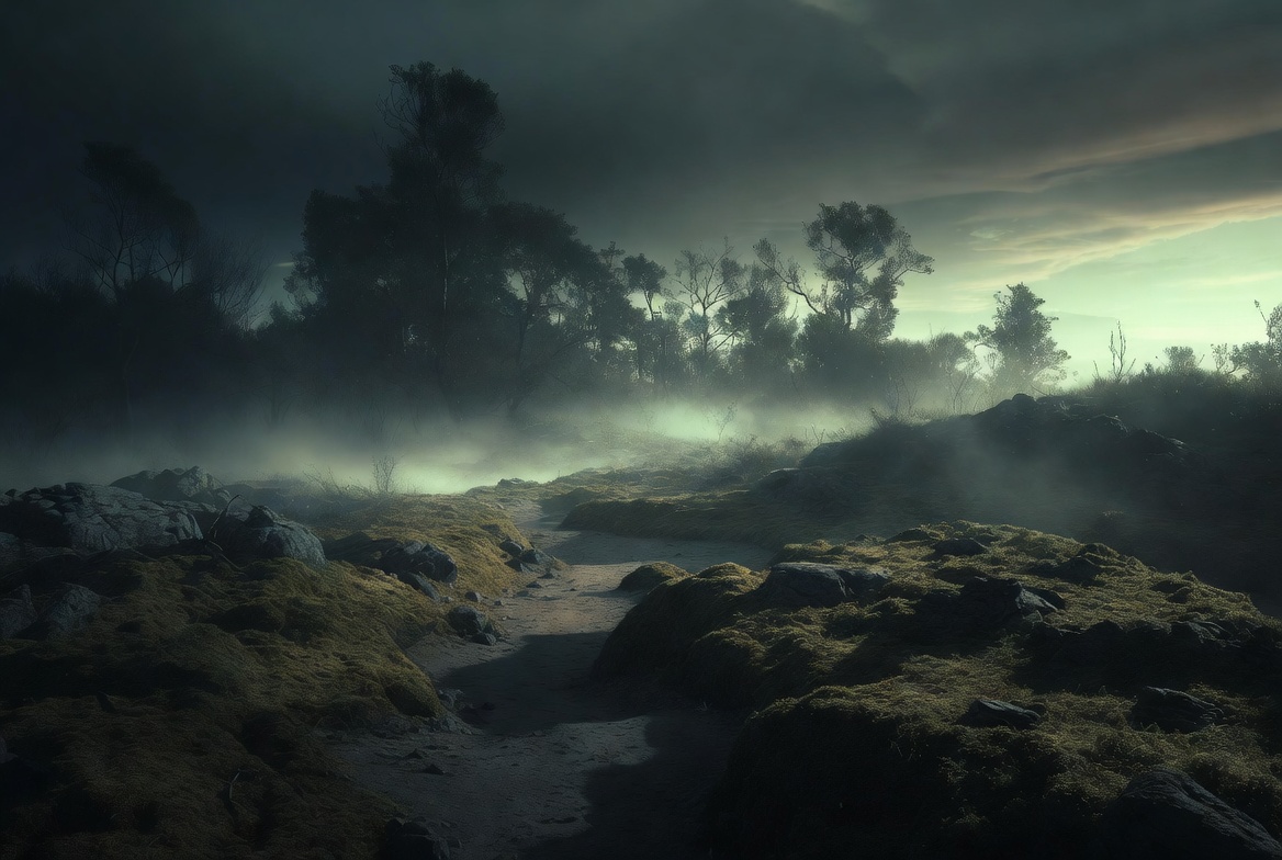 atmospheric landscape, barren trees, dark forest, eerie, fog, foggy trail, green moss, landscape, mist, moss, nature, overcast sky, path, rocks, rocky terrain, stormy sky, trees, twilight, wilderness, misty path