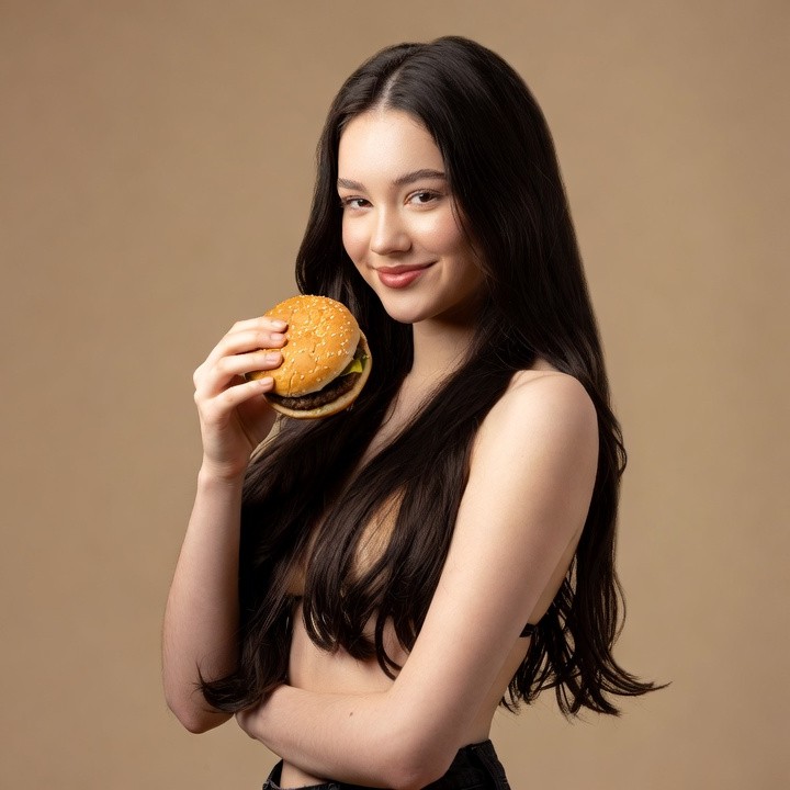 A young Asian woman with long straight black hair holds a sesame seed burger in her hand. She smiles at the camera while standing against a beige background. She wears black pants and is topless.