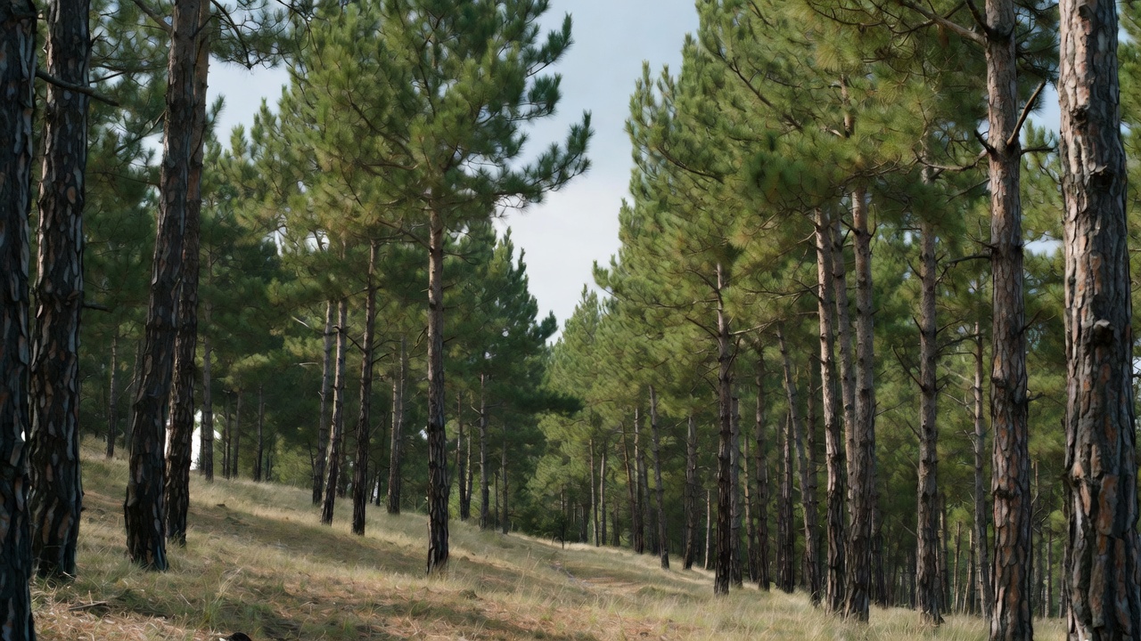 A dense stand of tall pine trees covers a gentle grassy hillside under a clear blue sky. Sunlight filters through the green pine needles, casting shadows on the forest floor. The trees are spaced evenly with textured bark visible on their trunks.