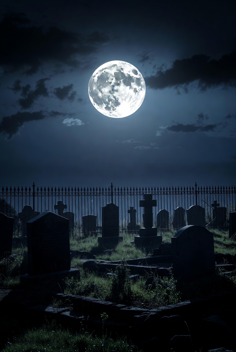 A large full moon illuminates a foggy cemetery at night. Numerous gravestones and crosses are visible behind an iron fence. Sparse grass grows among the tombs under dark cloudy skies.